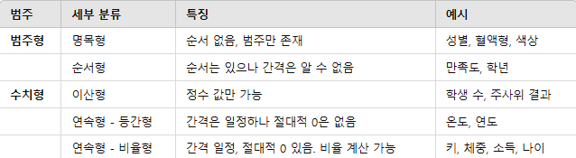 변수의 범주 타입으로, 데이터의 특성을 이해하고 분석 방법을 선택하는 데 중요한 기준