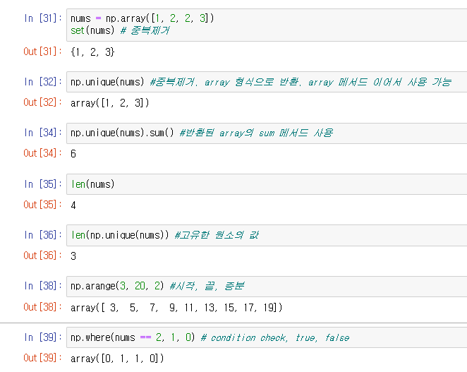 - np.unique() :  numpy의 라이브러리이기 때문에 위에서 사용한 메서드가 아니라 unique 함수이다