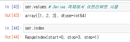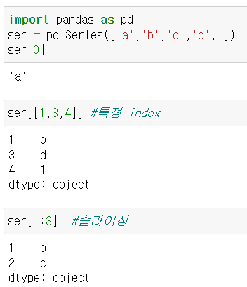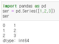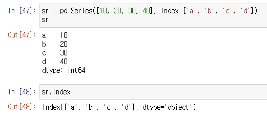 - 1차원 객체. index, value로 구성. Series() 함수와 대괄호를 사용하여 생성