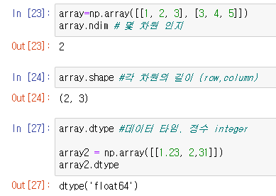 - .ones: 지정된 모양(shape)과 데이터 타입(dtype)을 갖는 모든 요소가 1인 배열을 생성한다.