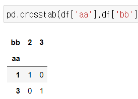 - 두 변수를 조합하여 살펴볼 때 사용하는 pandas 함수