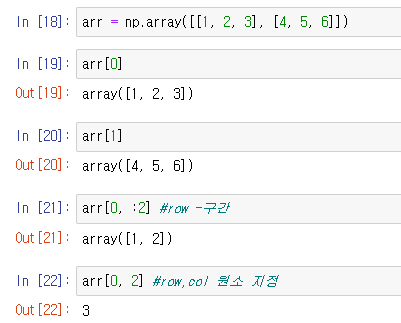 - Numpy는 명시적 인덱스 없이 '0'부터 정수형 인덱스를 사용하여 접근
